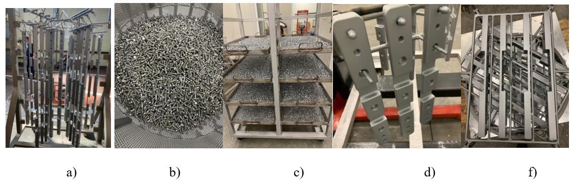 | Metode nanošenja “zinc flake”: a) prskanje, b) bubanj, c) platoi za zapecanje, d) alati, f) alati | |